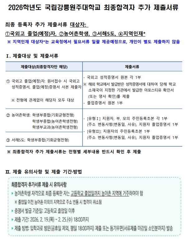 2026학년도 수시모집 최종합격자 추가 제출서류 안내